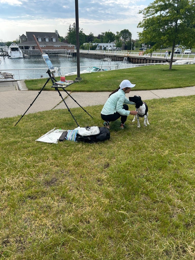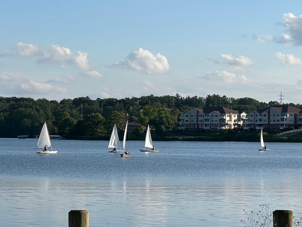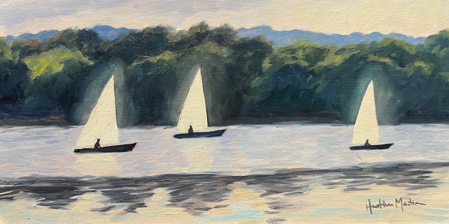 We went searching for a third painting spot, but nothing was feeling right. It was partly because we were both just so hot and exhausted, but on the way home we made a little stop at Boardman Lake back in Traverse City. These little sailboats zooming chaotically and comically in the lake were so cute, I wanted to attempt to paint them.