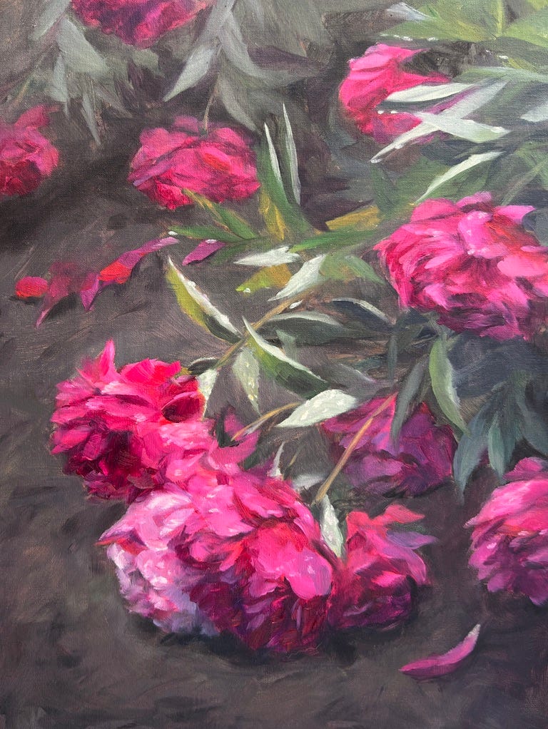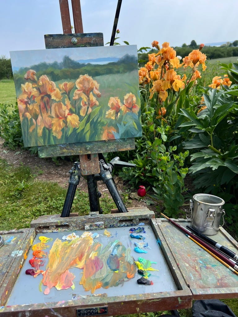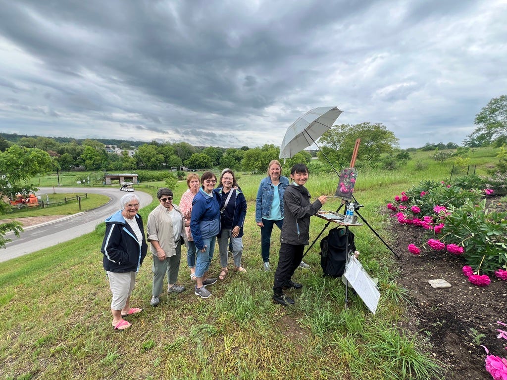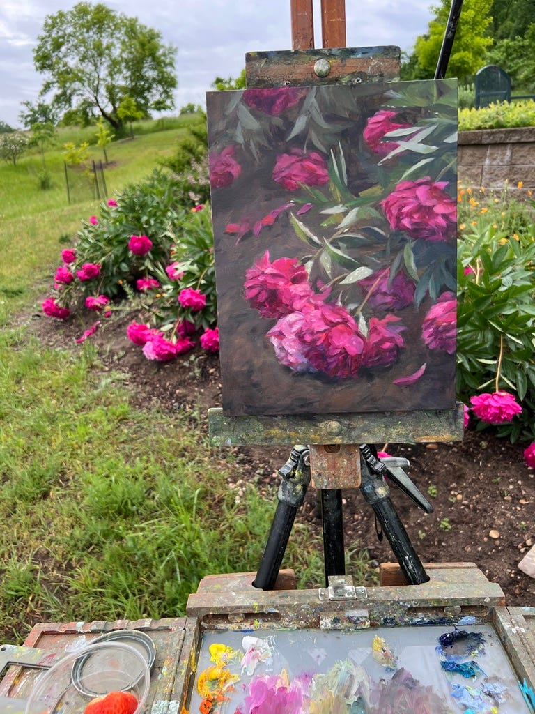 The peonies were show stopping, and were all weighed down with the recent rains. I decided to choose this inconvenient and slightly treacherous spot on a steep hill to paint them. Onlookers had to use extra caution, and I almost went rolling downhill numerous times. My “fanclub” came out (friends and family), and we all enjoyed a feast after.