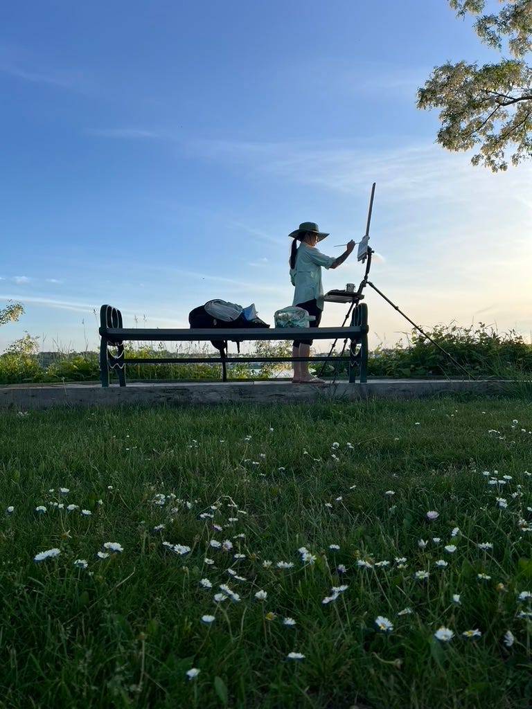The sun was actually setting as we drove home, and we stopped at a park to watch it and skip stones (very poorly). Did I want to paint it? Yes, but sometimes a sunset should just be enjoyed.