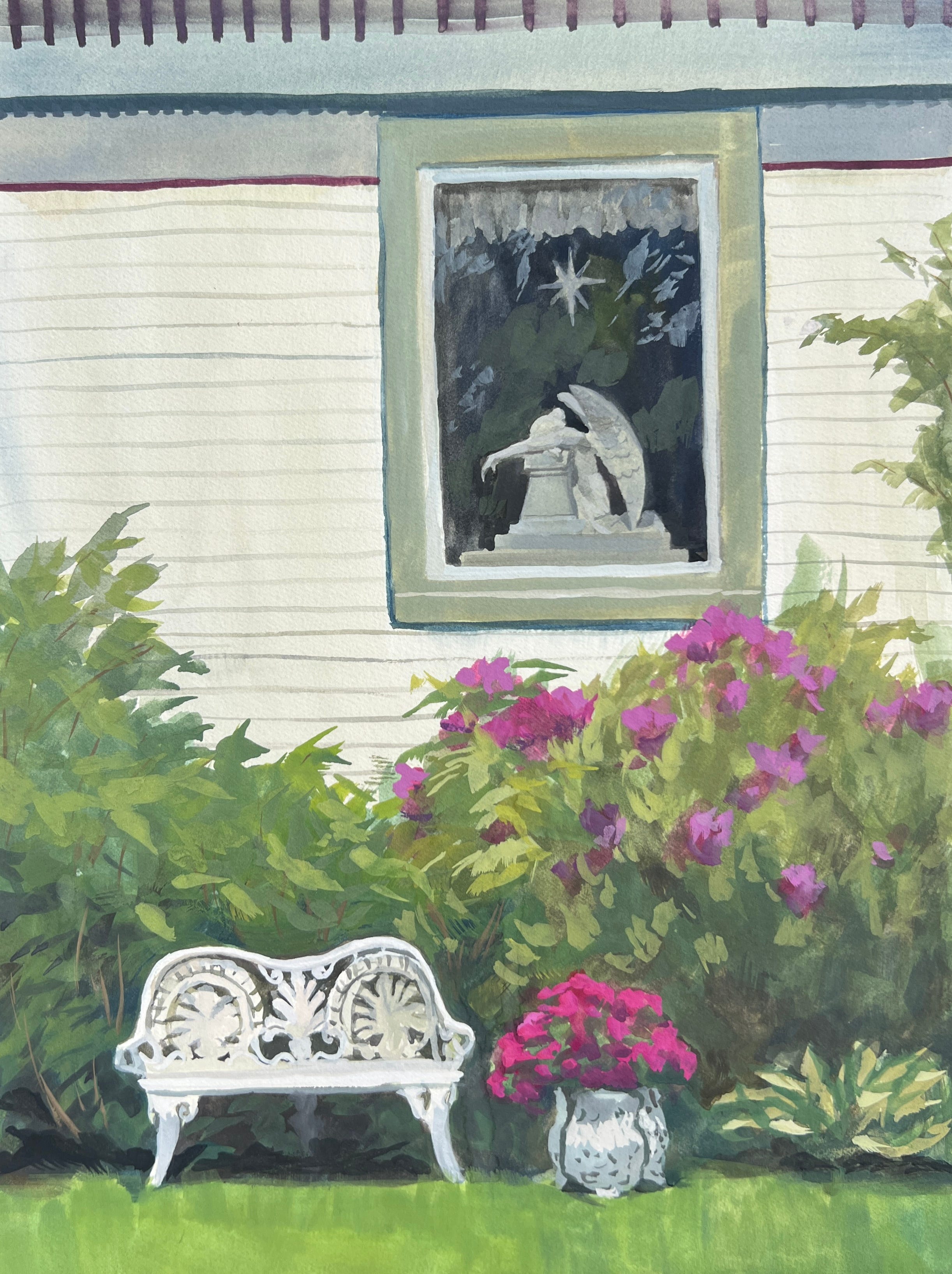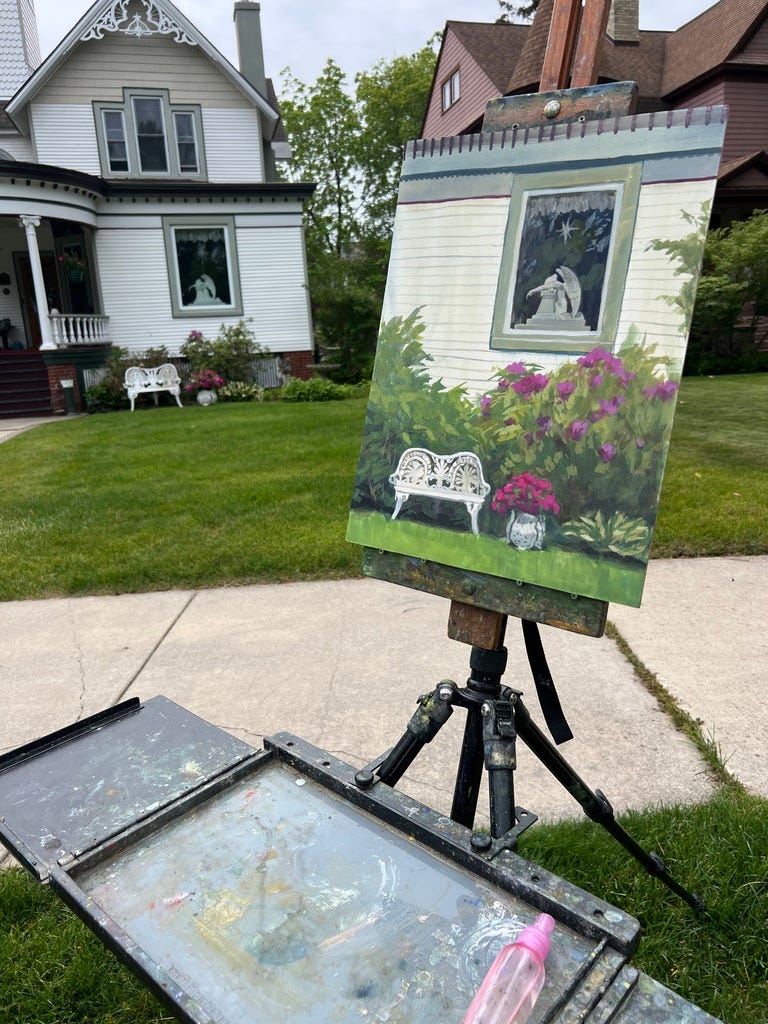 Each day we are scheduled to be painting in certain areas in the county. Day 2 was set in Leelanau County, an area of land northwest of Traverse City. We had a late start to the day though, because I really wanted to paint this window downtown. That angel statue is so devastatingly beautiful. The homeowner came out to talk, and told me it was for her son that had passed away. She then went on to tell me the history of the house and the area, which was just fascinating!