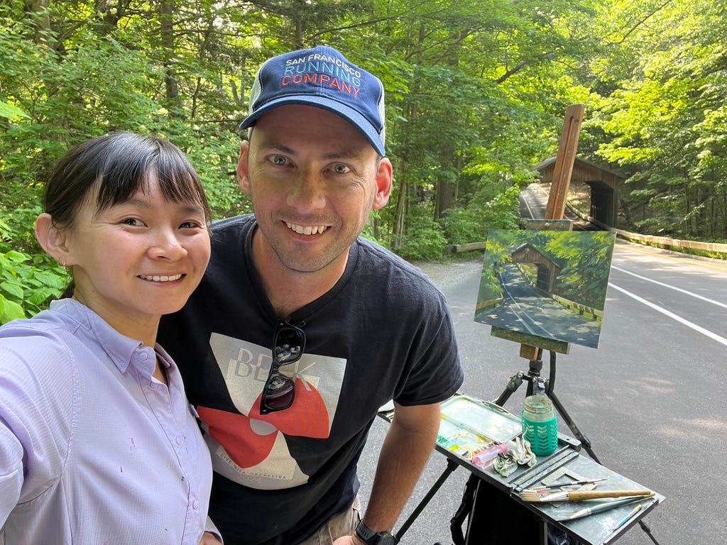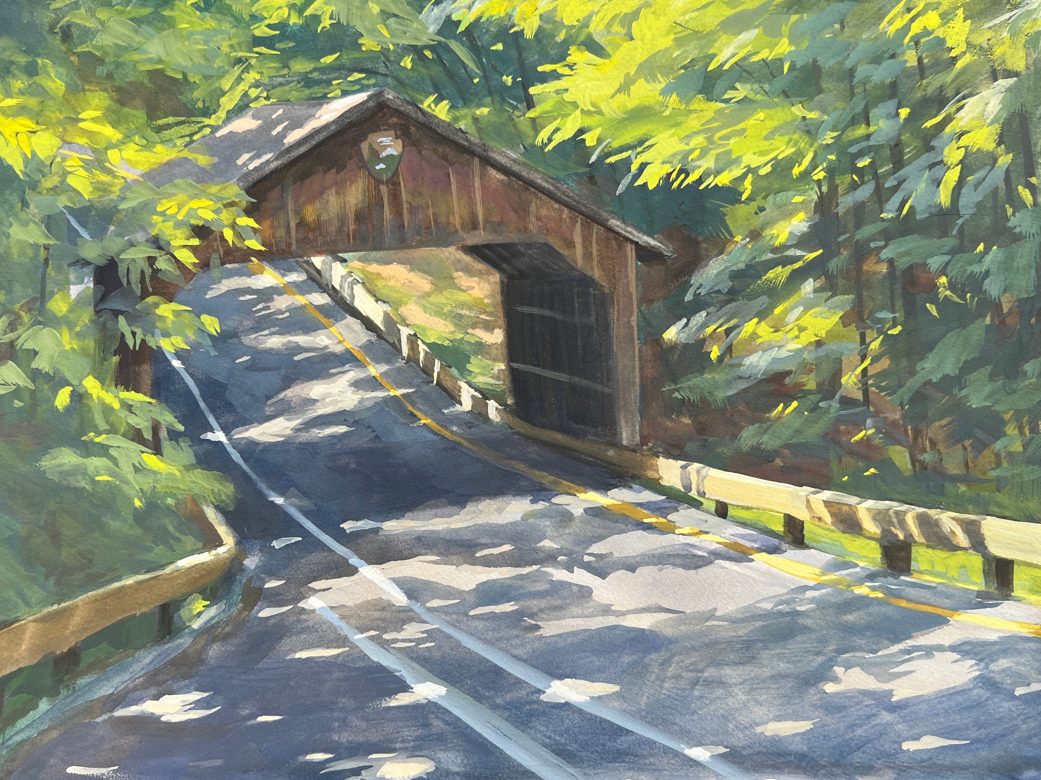 One spot that I wanted to make sure to show Jon was the Pierce Stocking Scenic Drive. While the entry fee is a little steep, it is SO worth it! You can enjoy a peaceful slow drive with several spots to get out and see the scenery. I decided to paint this covered bridge, because that dappled light was just too good to not.