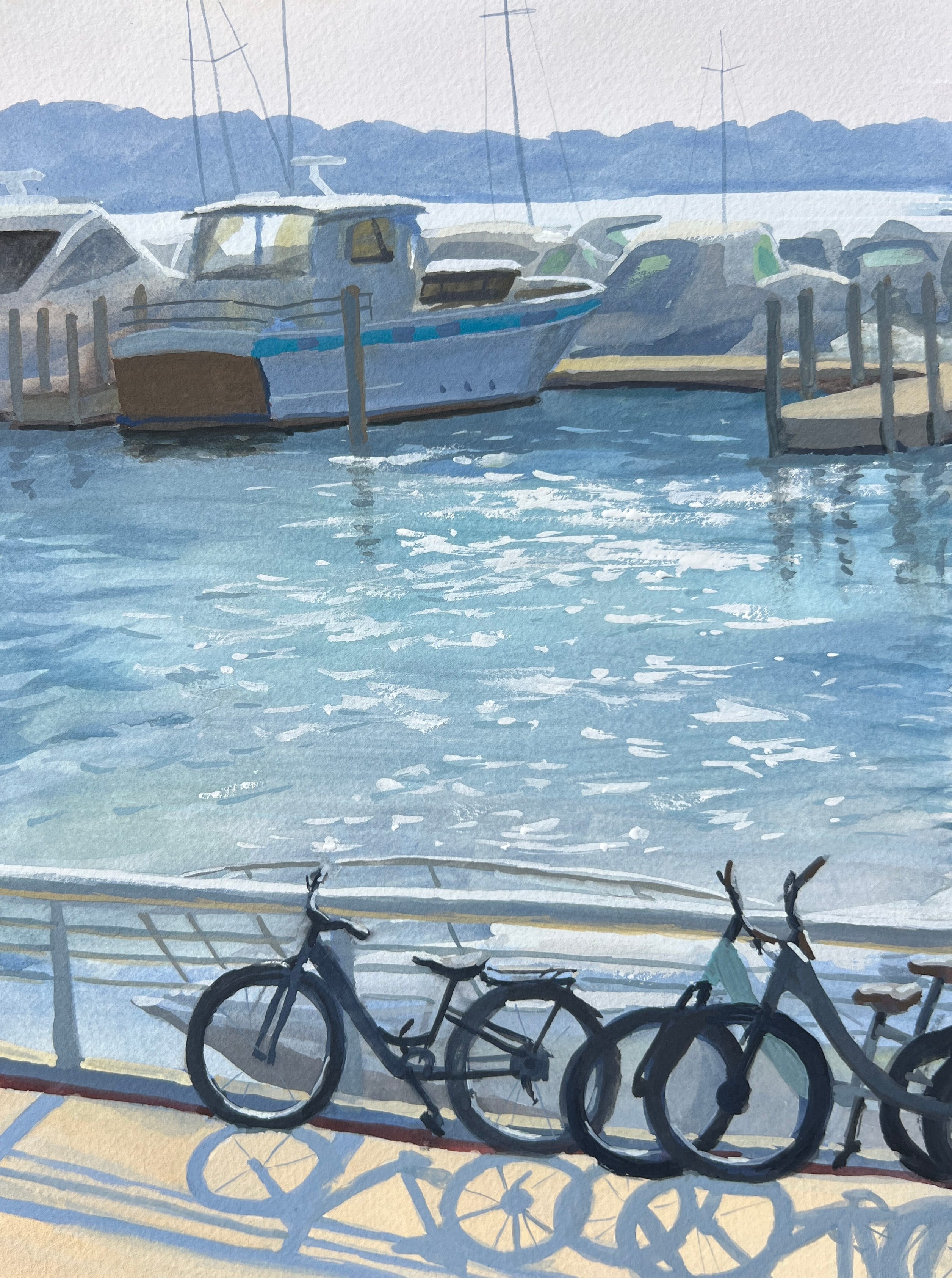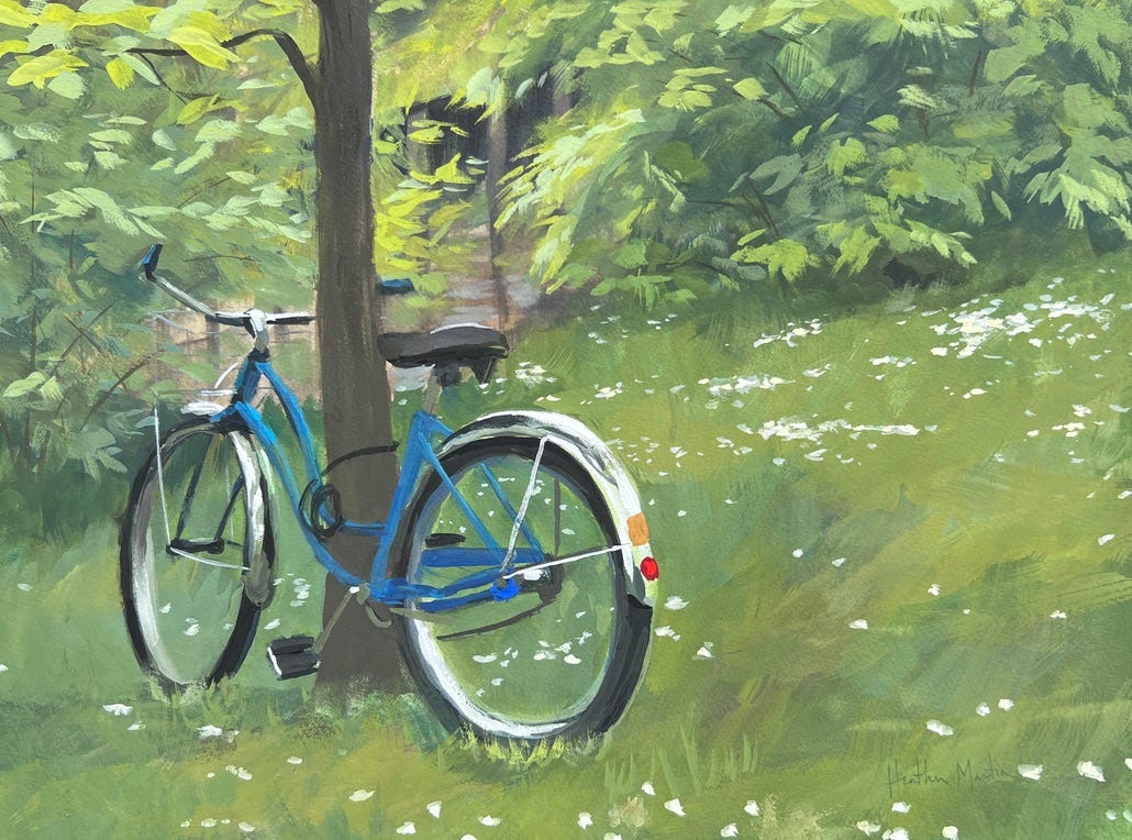 What drew me to this scene was of course that brilliant blue bike and eye-catching chrome detailing, but also the little white daisies on the ground, and a peek through the bushes to the river behind. Little black squirrels scampered all around and provided ample entertainment. I didn’t know how long the bike would be there, so I painted furiously. Luckily the owner was out fishing and gave me a good hour before taking it away.