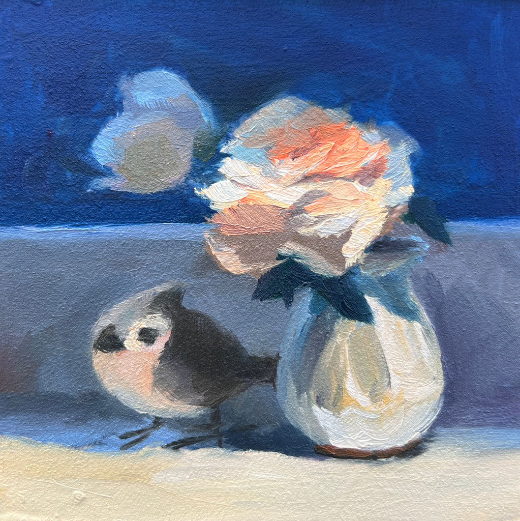 A few of my favorite things. A little Oak Titmouse sculpture with a small vase I made, and some of the last roses from our garden.